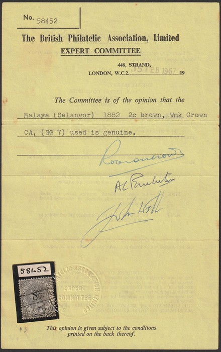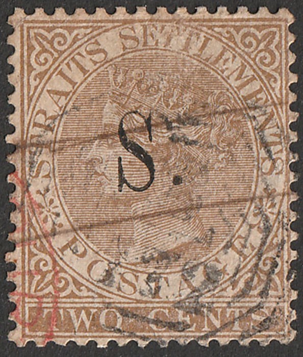 opt QV Straits 2c brown. F-VFU, octagonal cancel plus horiz security m/s. Scott 3 cat US$3300. SG cat £5000. Extremely rare genuine as only tiny number recorded all in used condition. 1967 BPA photo-cert while diff new certificate can be