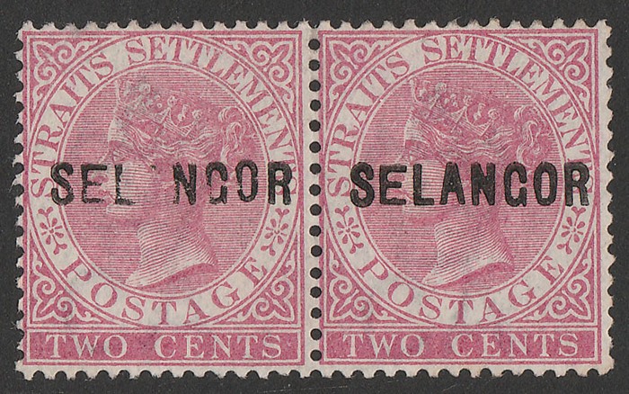 'SELANGOR' opt QV 2c pale rose horiz pr, opt SG type 14, left stamp variety 'A' in 'SELANGOR' almost comp omitted. VF UN. SG 21(var) cat £450++ as normal singles, plus premium for positional setenant pr with variety which should be at least