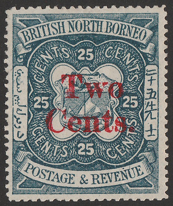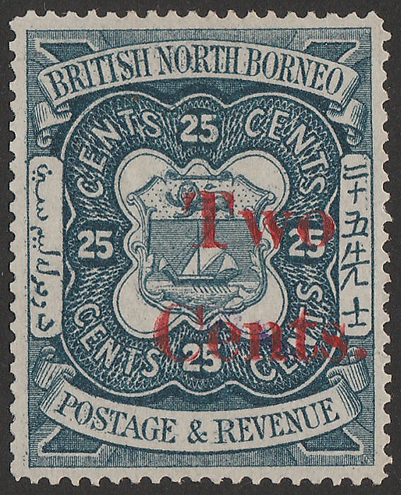 opt Arms 25c indigo 3.5mm spacing (1st printing). Superb U, red 'Sandakan' cds. SG 51 cat £95+. (P) (Image1)