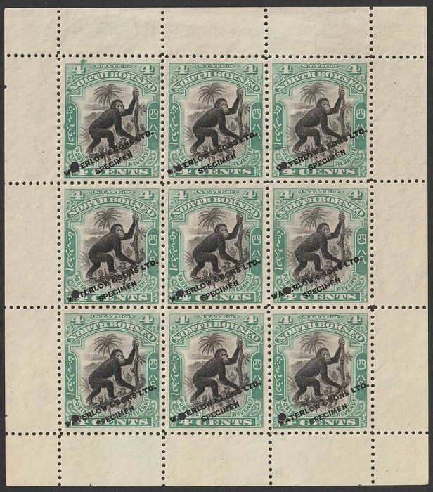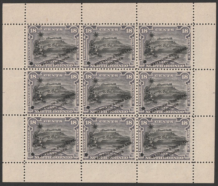 black & green colour trial proof with 'Waterlow & sons Ltd Specimen' 25 deg opt & sm security punch, sheetlet of 9. VF UN as made. SG 98(p). Rare. (P) (Image1)