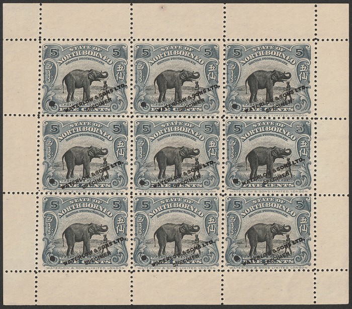 black & grey colour trial proof with 'Waterlow & Sons Ltd Specimen' 25 deg opt & sm security punch, sheetlet of 9. VF UN as made. SG 165(p). Rare. (P) (Image1)