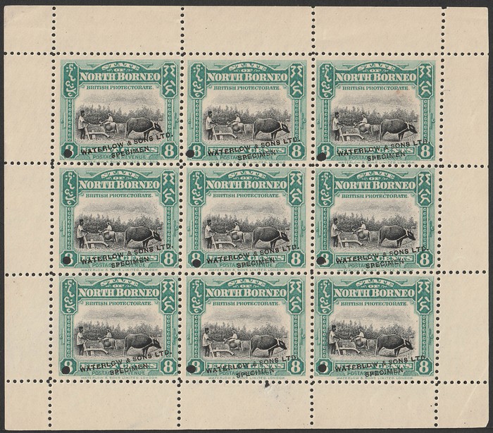 8c black & green colour trial proof with 'Waterlow & Sons Ltd Specimen' 25 deg opt & sm security punch, sheetlet of 9. VF UN as made. SG 169(p). Rare. (P) (Image1)