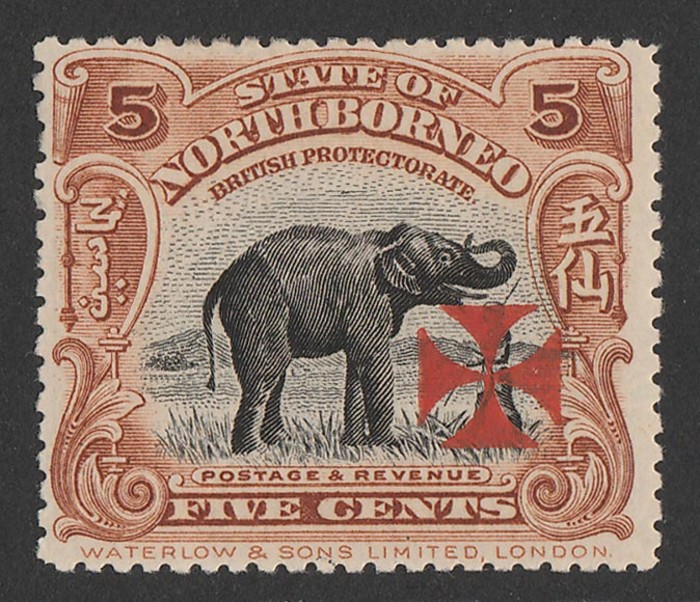 vermilion opt Elephant 5c black & yellow-brown, perf 13½-14. VF fresh M. SG 193 cat £60. (Image1)