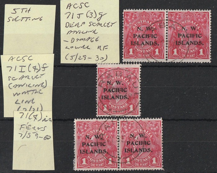 red varieties 5th setting inc deep scarlet-aniline, 'damaged LR frame' (ACSC 71J(3)g), scarlet -'wattle line' (ACSC 71L(4) f) & 'ferns' (ACSC 71(4)ia). VFU with full Rabaul cds. SG 103(var) has listed varieties at £100 each U (= £300) &