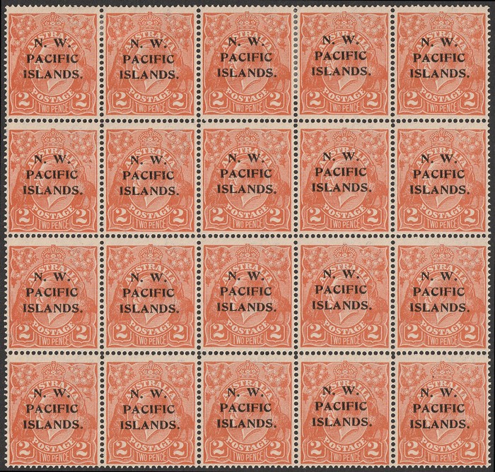 brown-orange, 5th setting, blk of 20, identified as 8L31-35, 8L37-41, 8L43-47, 8L49-53, identified from minor flaws. VF 4 MLH / 26 MNH. ACSC 95A cat $900 as basic stamps. SG 121 cat £200+ as M singles. Ex Sandy. (20) (Image1)