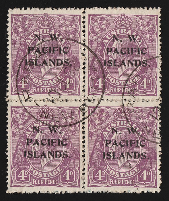 violet blk of 4. VFU, 'Rabaul 10 JL 22' cds. SG 123 cat £160+ as singles, plus premium for rare postally U multiple. (4) (P) (Image1)