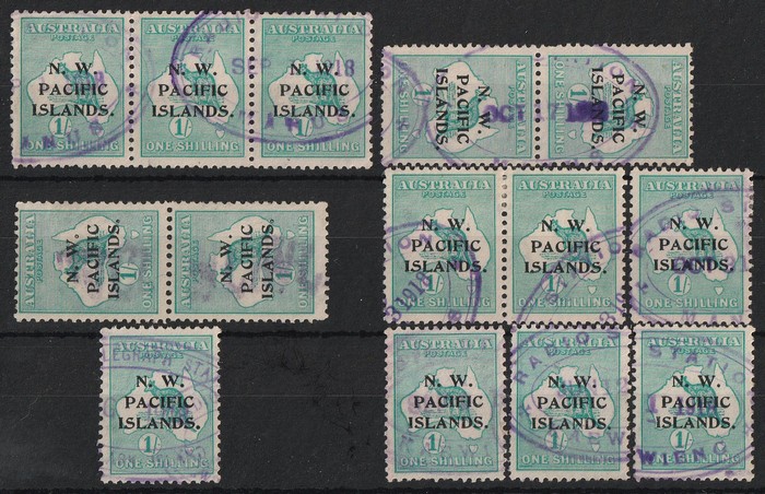 1/- green, 2nd wmk, 4th setting, range of scarce to rare Radio Station cds inc strip of 3, prs & single inc comp Radio Station Manus on strip of 3 (rating G), part cds of Radio Station Kaewing & Radio Telegraph Station Woodlark Island. All appear to