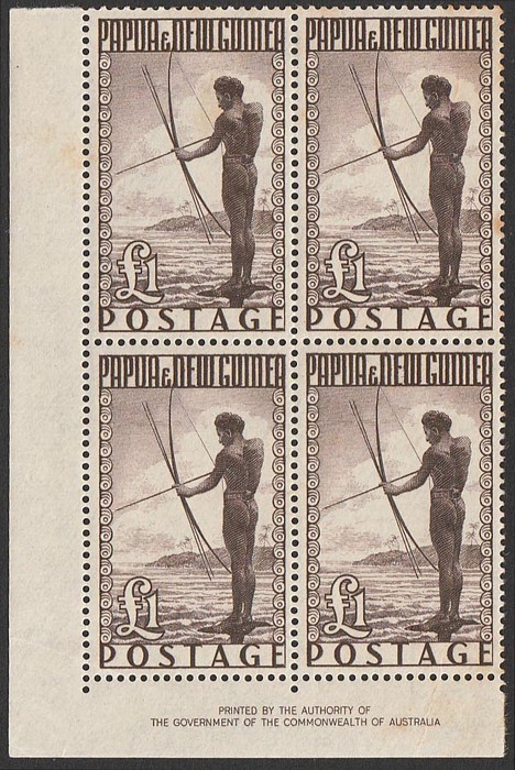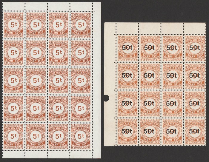 brown, marginal blk of 20, plus 1984 '50t' opt Stamp Duty 5t brown, UL cnr marginal blk of 10. VF UN (5t)/MNH (50t). Bft 63, 78 cat £100 for singles, plus blks. (2 blks)