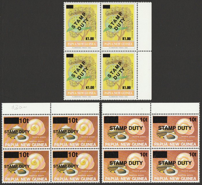 opt Shells 10t on 40t, plus larger letters & opt in centre. 1988-95 'STAMP DUTY' opt Flowering Tree 1K on 90t, all blks of 4. VF fresh MNH. Bft 100, 101, 105 cat £320 for singles, plus premium for blks. (3 blks) (Image1)