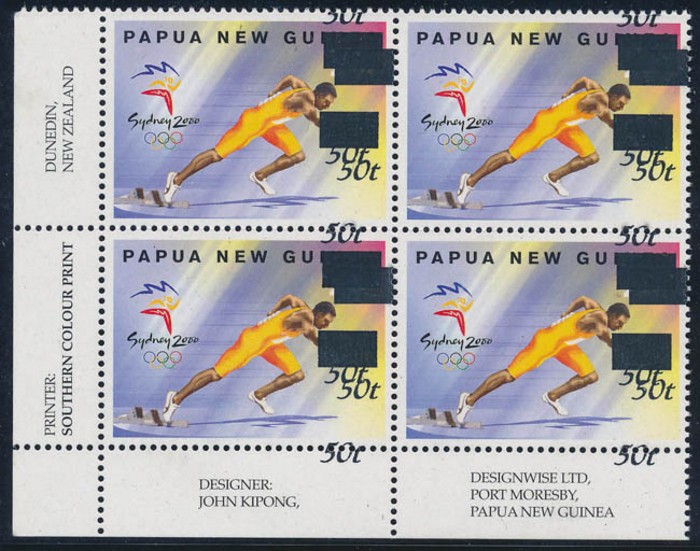 Sydney 2000 Olympics, error opt TRIPLE! LL cnr imprint blk of 4. As one opt is greatly shifted down the 50t appears in the sheet margin at base just below the bottom row of stamps & is missing from the top row, thus the 5 upper stamps in sheet had 3