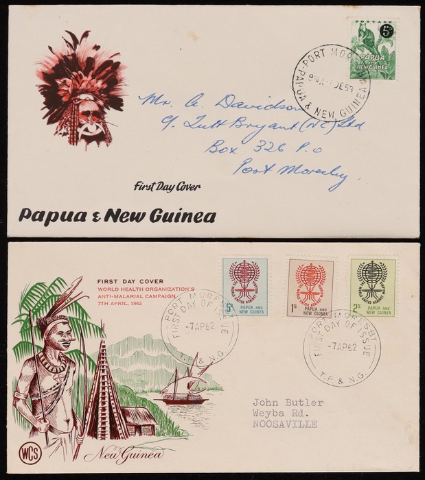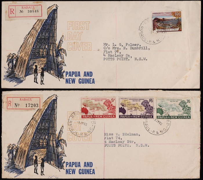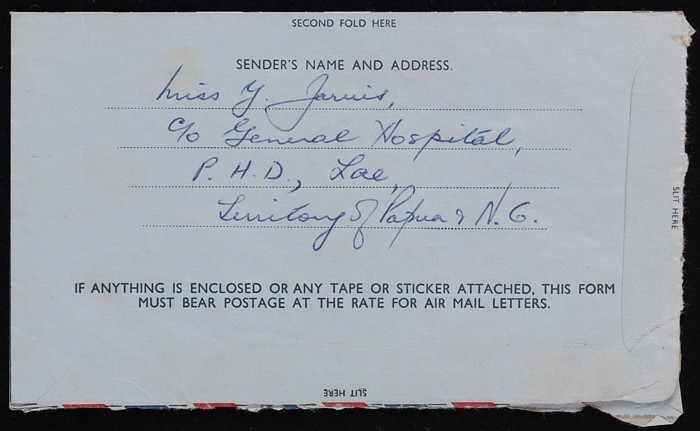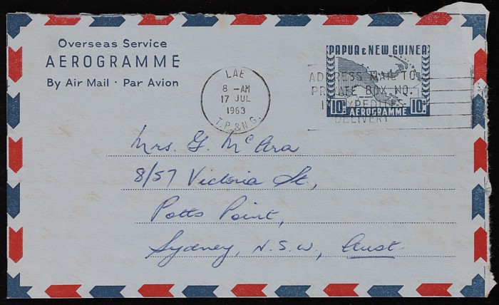 blue with 3 lines of text at left. VFU to Sydney, 'Lae 17 JUL 1963' pmk. AAMC PNG7 cat $75. (Image1) (Image2)
