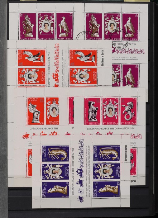744 imageBritish Commonwealth: Massive M/sheet accumulation with 75 diff in 4 hanger album inc Australia Local Railway Post (24) with 4 diff inc imperf variations & SPECIMEN opts, plus 1970 Cook Bicent imperf (12, retail $120). Gilbert Is 1978 QEII SJ (18, FV $49). Kiribati 1979 Rowland Hill (20, FV $20). Cook Is/Penrhyn 1978 QEII SJ (40 with 4 diff, FV $170), Norfolk Is 1974 UPU (3, retail $135). Pitcairn (85 mixed FV $170) with 8 diff inc 1978 QEII SJ (12), AUSIPEX 84 (8), 1981 QM 920) London 1980 (9) & 1974 Shells (10). Samoa (200 mixed) with 11 diff (FV Sam $235) inc 1975 'Joyita' (6), 1975 Christmas (7), CAPEX 78 (19), Christmas 78 (33), London 1980 (34), ZEAPEX 80 (43) & 1981QM (20). NZ Cinderella M/Sheets (30) inc 1984 Pigeon Flight (20). PNG (69) with 1975 Independence (50) & 1985 PU Centenary (9). Seychelles London 1980 (15), 1980 Olympics (8) & 1984 Olympics (7) Singapore 1998 Joint Issue (30, FV $117), plus 8 others inc Changi Airport (3). Tristan da Cunha (15) with 4 diff inc 1981 Dodgson (4), Ships Crests (6) & Shipwrecks (5). Tuvalu (80, FV $64) inc 1982 RV (25) opt SPECIMEN, 1996 Year of the Rat (40) & London 1980 (9). Vanuatu (92, FV $144) with 1982 Christmas (6), 1981 Christmas (12), 1983 Communication Year (13) AUSIPEX 64 (13), 1985 Independence (12), 1985 QMCII). AMERIPEX '86 (12) & 1983 Economic Zone (14), plus Solomon Is, Mauritius, Norfolk Is, Malaysia & Nauru. All fresh & clean. Huge Face Val & even higher retail. (800 M/Sheets). (Image1) (Image2) (Image3) (Image4) (Image5) (Image6) (Image7) (Image8) (Image9) (Image10) (Image11) (Image12) (Image13) (Image14) (Image15) (Image16) (Image17) (Image18) (Image19) (Image20) (Image21) (Image22) (Image23) (Image24) (Image25) (Image26) (Image27) (Image28) (Image29) (Image30) (Image31) (Image32) (Image33) (Image34) (Image35)