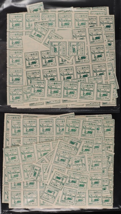 759 imageBurma 1943 Japanese Occupation Farmer 30c deep blue-green, stock of 1000 stamps!, mostly in part sheets. F-VF UN as issued, mostly very fresh. JSCA 2B48 cat Y250,000, SG J81 cat £1250 = A$2400. (1000) (Image1)