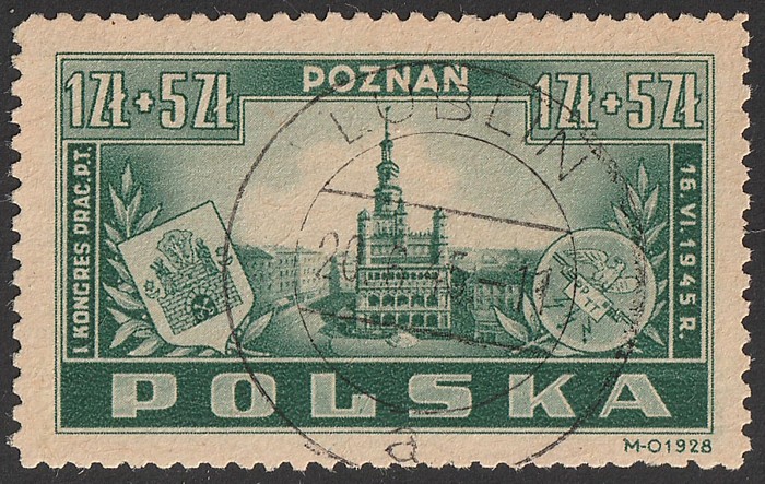 Congress 1+5zl green. Superb U, 'Lublin 20.6.45' cds. SG 530 cat £50+. Mi 403 cat €80+. Scarce genuine used. Exp Ceremuga AIEP. (Image1)