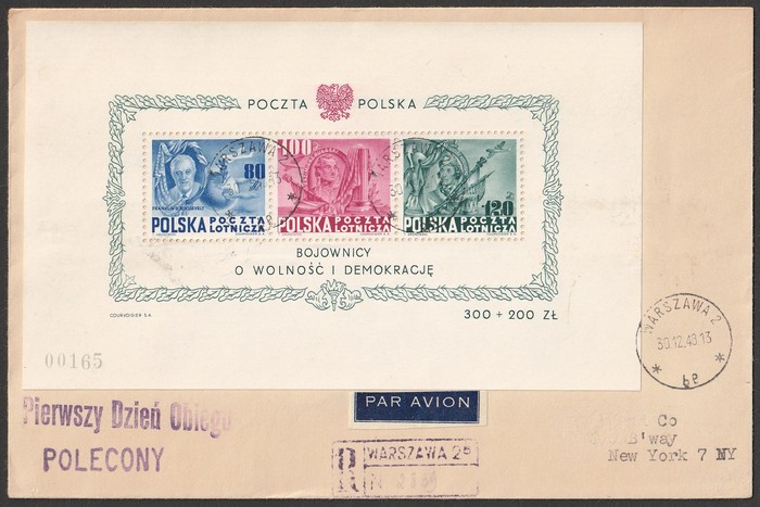 M/Sheet 80zl-120zl tied to registered cover by 'Warszawa 30 12 48' FDC cds. Superb U, original size 159 x 95mm. SG MS645d cat £900, plus premium for FDC. Mi Blk 11 cat €1400 as FDC. 2024 Ceremuga AIEP photo-cert. (P) (Image1) (Image2)
