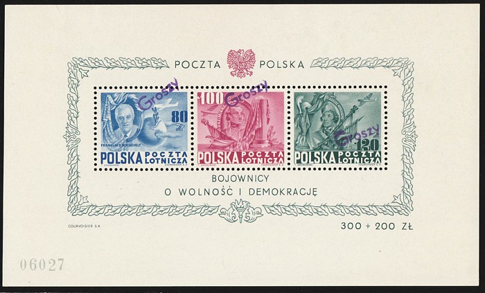 Revaluation 'Groszy' violet opt type 23 of Warszawa on 1948 Roosevelt M/Sheet, diag opt on ea stamp. VF fresh MLH, stamps MNH. Mi Blk A11 cat €700, SG MS645d(var) cat €550 as normal & should be at least +50% with opt, so £825. 2018