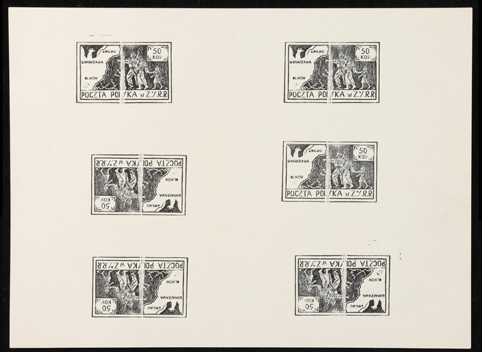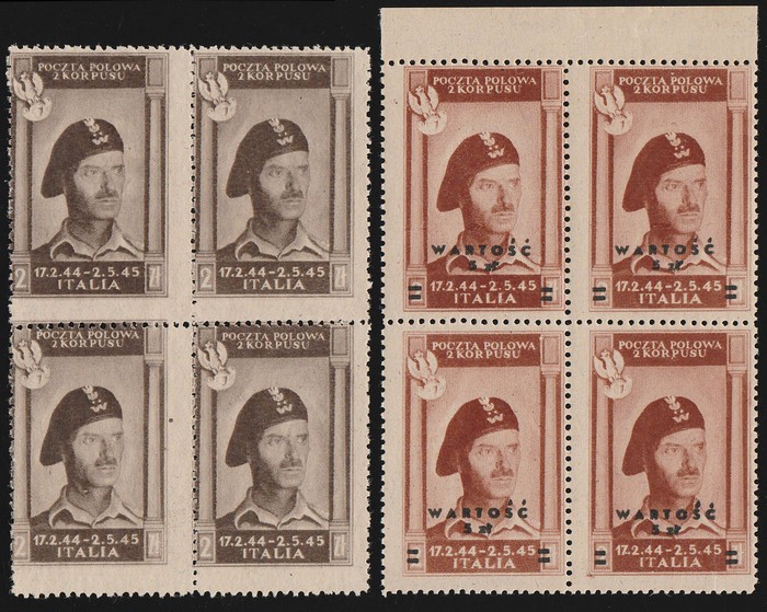 Central Asia 50k brown 'Dojdziemy' issue, roul at sides, reprinted proof sheetlet of 4 showing a tete-beche pr in middle, with 'Glowna Poczta Polowa Polskich Sil Zbrojnych w Z.S.R.R.' h/s at top of the Chief Fieldpost Office of Polish Forces in the