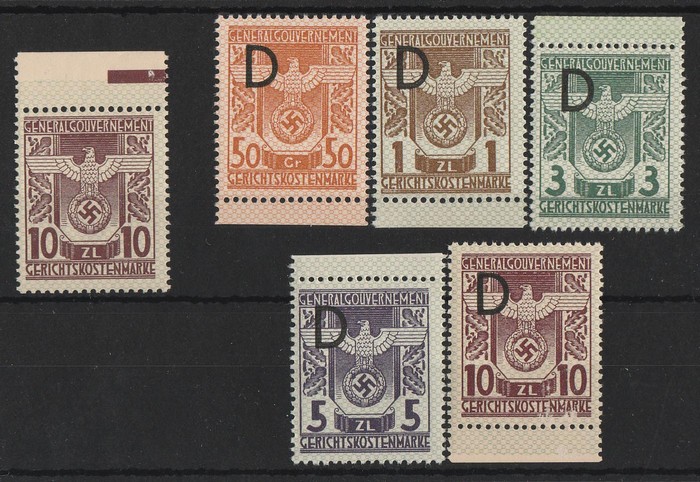 Govt: 1942 Court Fee revenue 10zl,, plus 1943 'D' opt Court Fee set 50gr-10zl. VF fresh MNH. Bft 13-18 cat £150+ as M or U, plus premium MNH. (6) (Image1)