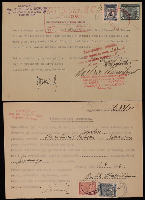 Govt: 1940-44 legal documents with various Stamp Duty & Court Fee revenues to 5zl, inc mixed frankings. Mostly F-VF. Interesting lot. (11 docs) (Image1) (Image2)