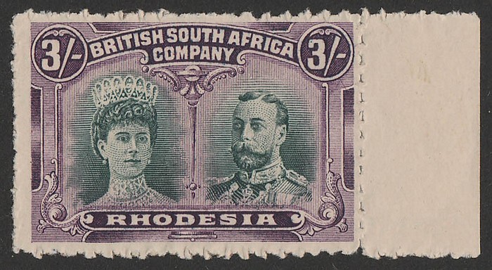 Head 3/- green & violet, unofficially rouletted, as made from IMPERF proof sheet. VF fresh MNH, right marginal. SG 158(var), normal cat £250 for M, should be at least double, £500 MNH. (P) (Image1)