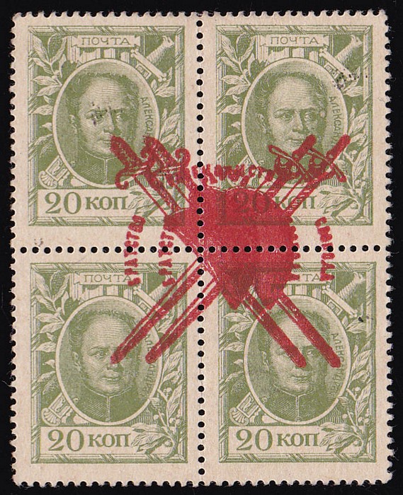 Revolution 'Crossed Swords & Cap' red opt Romanov 20k green, blk of 4 stamp currency printed on card, error opt DOUBLE. VF UN as made. Scarce historical item! Exp Trachtenberg. (P)