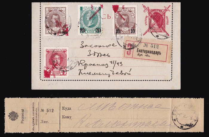 Revolution 'Crossed Swords & Cap' red opt Romanov 4k postcard (Mi P28) uprated same opt Romanov 7k & 20/14k green, tied by Ekaterinaberg 17.2.18 cds, with registered label & receipt. Very rare historical item. (P) (Image1)