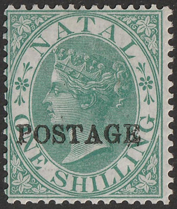 opt QV Chalon 1/-green, error opt DOUBLE, opt SG type 18. F-VF U, Durban cds. Scott 50a cat US$425, SG 84a cat £700 & under-catalogued. Very rare & certificate can be obtained on request. (P) (Image1)