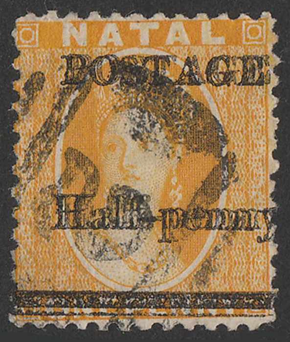 Half-penny' opt QV Chalon 1d yellow, error opt INVERTED. F-VF U, barred oval pmk. Scott 61b cat US$240. SG 91a cat £275. (P) (Image1)