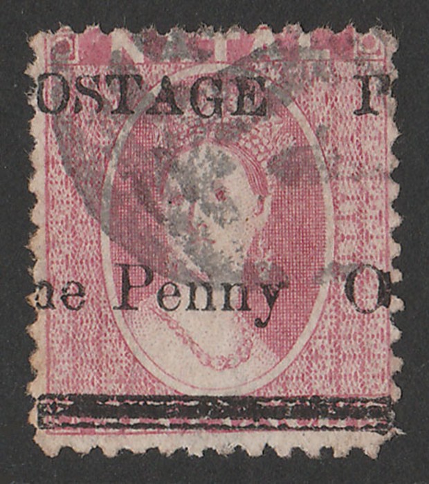 One Penny' opt QV Chalon 6d rose, error opt FOUR TIMES. VFU. Scott 63e cat US$300, SG 93d cat £325 & under-catalogued. Spectacular. (P) (Image1)