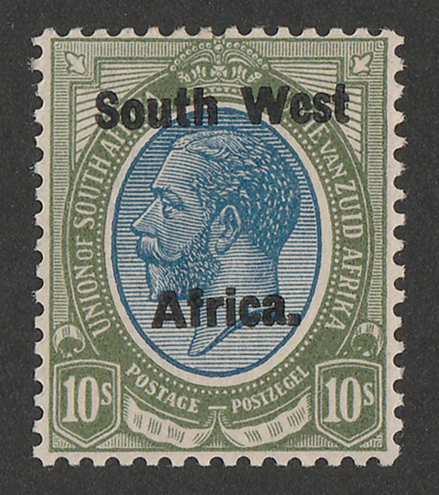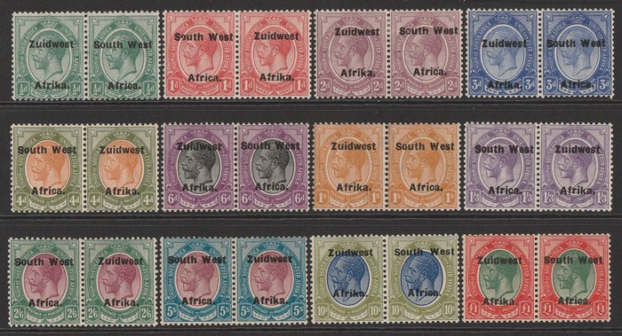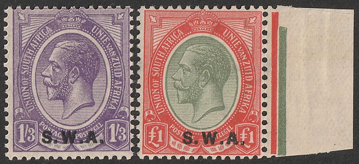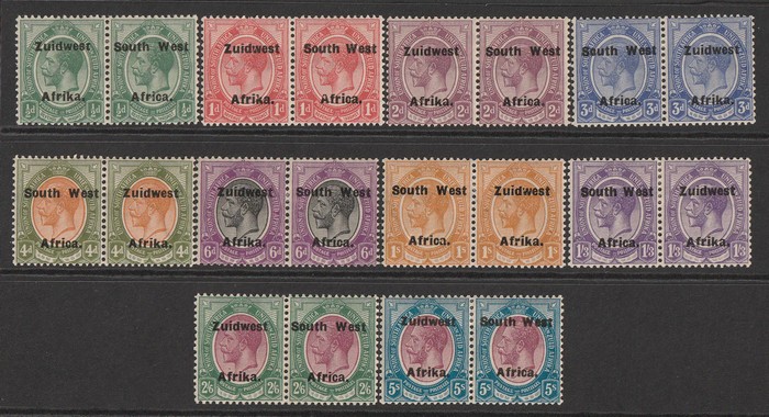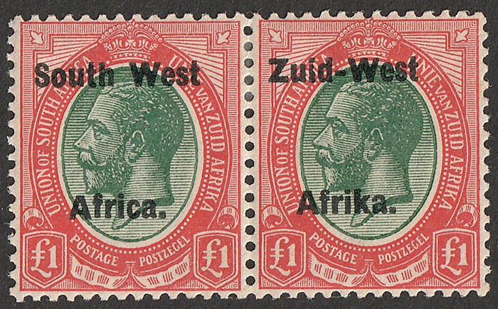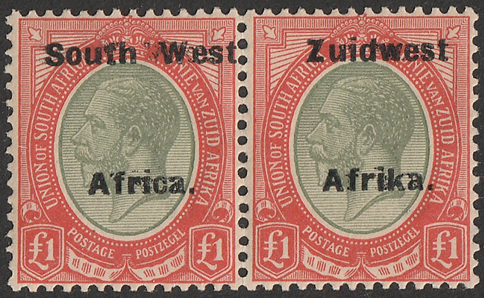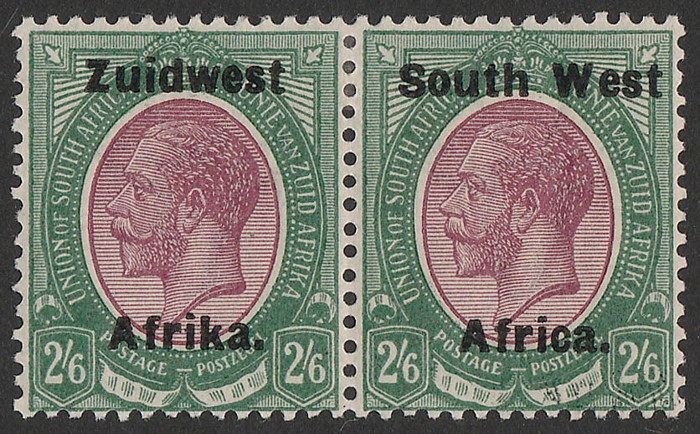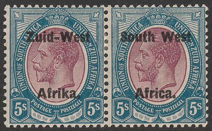Africa' & 'Suidwes Afrika' vert opt Ox Wagon 5/- black & green, horiz bilingual pr. VF fresh MNH. Scott 92 cat US$80 for M, SG 53 cat £75 for M, should be at least double, £150 MNH. (P) (Image1)