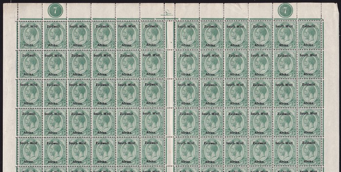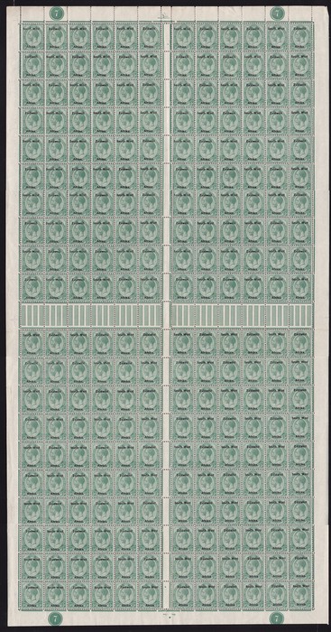 be at least £3120 MNH, plus premium for plate numbers & full sheet. Extremely rare full sheet & fantastic item for specialist study. (240). (P) (Image1) (Image2)