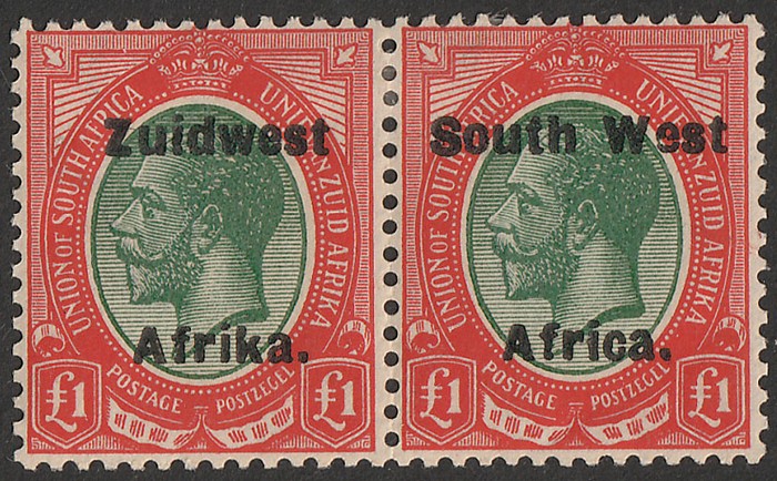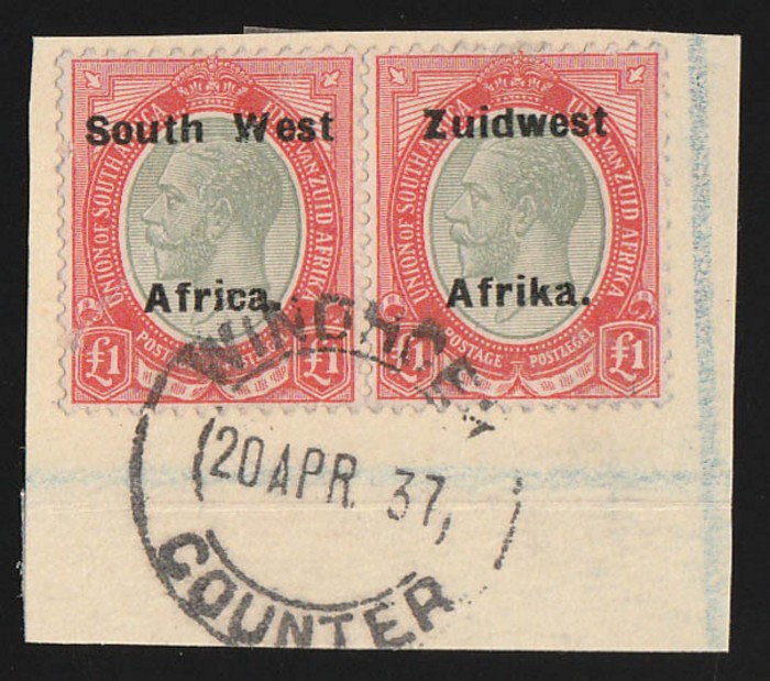 opt KGV £1 pale olive green & red se-tenant pr. U on piece with Windhoek cds, left stamp creased before use, right stamp superb. Scott 40 cat US$450, SG 40a ca £600. (P) (Image1)