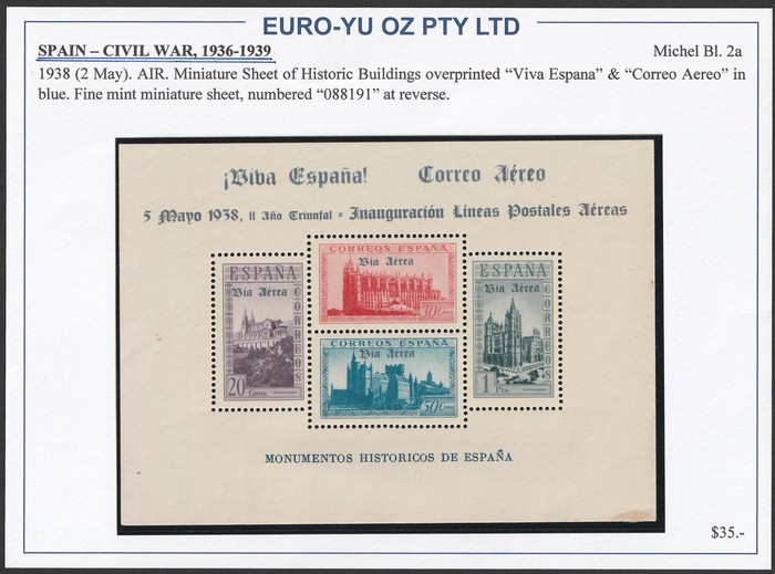 M/Sheet, with no 000223 on back. Superb MNH, much nicer than usual gum. SG MS857g cat £700 for M so at least double, £1400 MNH, Edifil 781 cat €1010. Key Civil War M/Sheet. (P) (Image1)