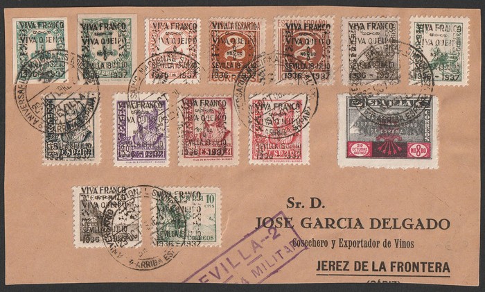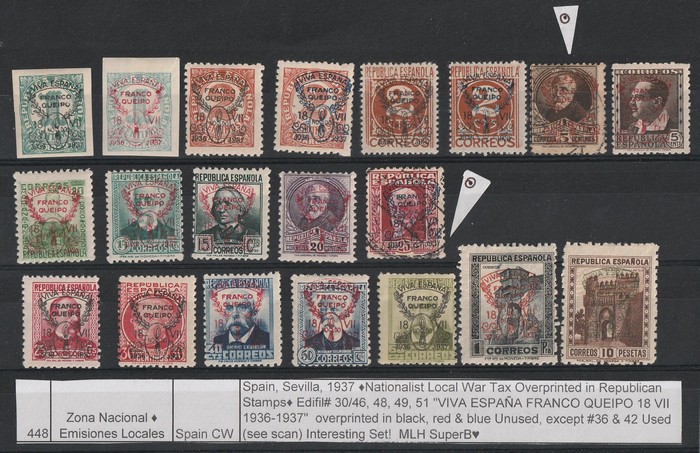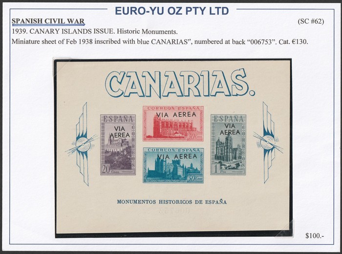 Canary Islands Republican opts near comp set of 20 to 10P brown. Nationalists opts (14) to 30c on cover front (SG cat ca £150), 1938 Pictorial Monuments M/S M opt 'via Aerea' 2 diff opts imperf or perf (cat €200). Total cat £150 plus