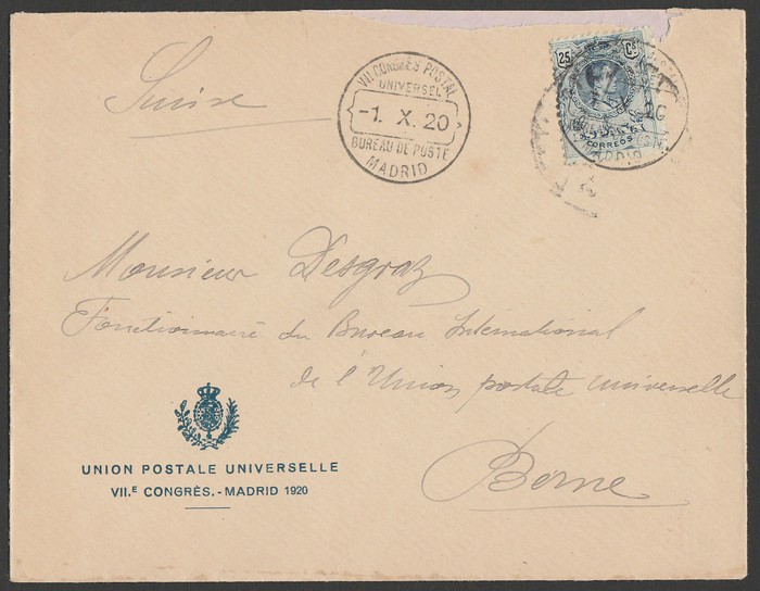printed official smaller cover franked King Alfonso XIII 25c, tied by type A special cds pmk 'VII Congres Postal Universal / 1.X.20', with another strike beside, to Switzerland. VF fresh, sl roughly opened at top. Ed 274 being usage of normal defs