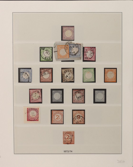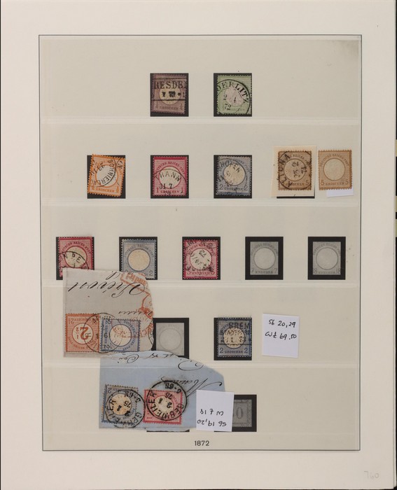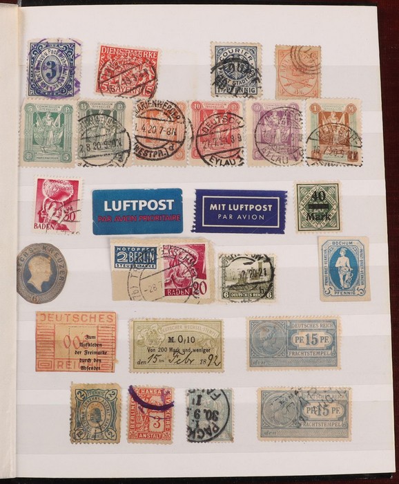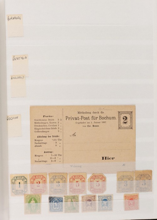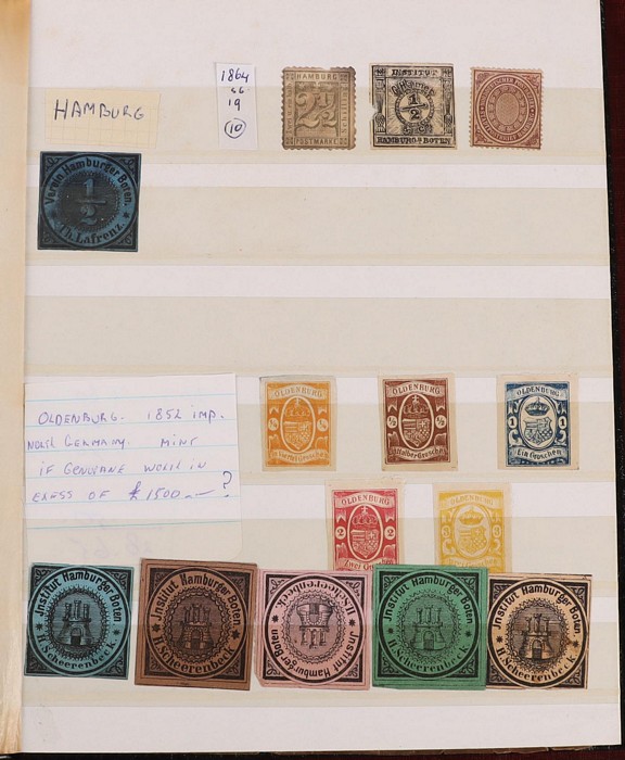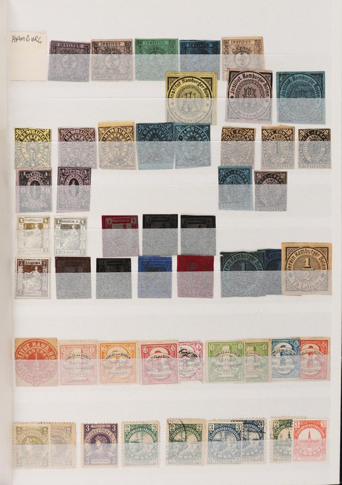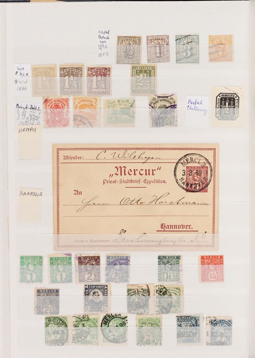 823 imageGerman Private Posts & States: 1852-1900 collection in s/book. States inc Brunswick 1852 Arms 2sgr & 1861 1sgr. Hamburg 1859 Arms vals to 7S, imperf. Private Posts Altona - Wuppertal inc Bergedorf 1887 Animals to 15pf. Berlin selection of diff posts inc 2 covers. Bochum selection plus p/card. Brunswick p/cards (3). Breslau 1897 Kaiser Birthday. Range of Hamburg Posts, Lubeck Ships to 15pf plus Portrait set. Most G-VF M/U, some mixed. Mi cat €1200+ = A$2100+. (275 + 18 covers/cards) (Image1) (Image2) (Image3) (Image4) (Image5) (Image6) (Image7) (Image8) (Image9) (Image10) (Image11) (Image12) (Image13) (Image14) (Image15)