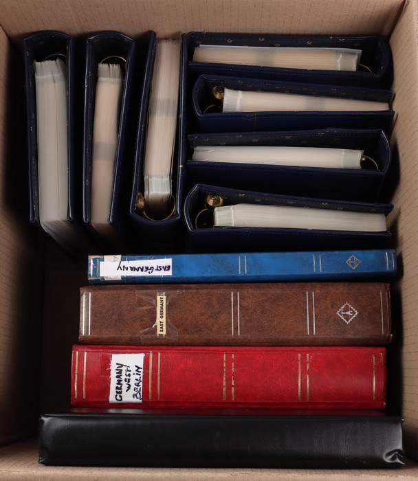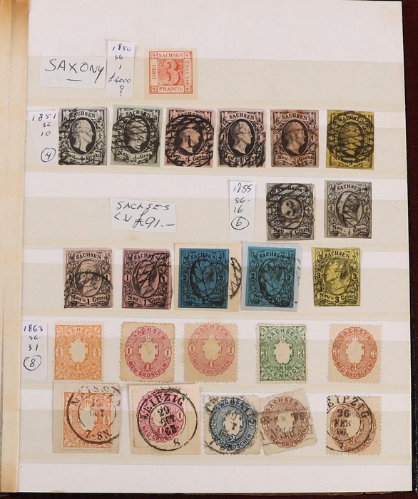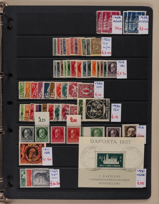 824 imageGermany 1850s-2010 valuable & extensive collection in 22 various s/books & 3 Linder illustrated albums commencing with German States inc Bavaria (130+) 1850s 3k & 6k imperf, 1880 Arms to 80pf, 1911 Luitpold to 2m, range to 1920s inc 1m Official, Saxony (20+) 1850 Arms 3pf (as is & not counted in cat value), 1851 Friedrich to 3ngr, 1855 Johann to 3ngr, 1863 Arms to 3ngr, Prussia 1850s 3gr & 4pf, Oldenberg (5) 1861 imperf to 3g yellow (as is & not counted), Heligoland (10) 1867 to 6sch & 1875 3pf U, range of WWI German Occup issues inc Belgium (70+), 1916 various to 2f50c, Poland (18), Eupen & Malmedy (10), Russia (20+) etc, others inc Danzig (150+), Allenstein various 1920-26 issues inc Official to 10m, Memel (60+), Lithuania (8) etc, Saar 1920-59, Germany inc 1872 to 5g, 1880 to 50pf, 1902 to 5m, extensive range to 1945 inc Inflation issues to 100,000m, 1928 President comp to 80pf, 1932 Hitler M/S etc Bohemia & Moravia (150+), Allied Occup 1945 to 80pf, 1946 to 1m inc apparent 75pf offset, 1949 Buildings to 5DM, Soviet zone 1948 Politicians to 84pf, West Germany7 extensive range 1950s to 200g inc 1970-76 & 1982-86 comp MNH on Linder pgs, East Germany 1950s-90s, Berlin (West) 1949-90 inc 1951 Bell set comp, 1986 Famous Women comp to 500pf (MNH & FU sets cat £360), small range of German colonies. 1998-2004 Deutsche Post first day cds. This is a very extensive collection which has only briefly been summarised & has a lot of potential. Some earlies mixed & albums have toning but largely not affecting stamps. Mostly G-VFU, some VF superb MNH. SG cat £20,000+ = A$40,000+. (10,000 + 50+ M/S) (Image1) (Image2) (Image3) (Image4) (Image5) (Image6) (Image7) (Image8) (Image9) (Image10) (Image11) (Image12) (Image13) (Image14) (Image15) (Image16) (Image17) (Image18) (Image19) (Image20) (Image21) (Image22) (Image23) (Image24) (Image25) (Image26) (Image27) (Image28) (Image29) (Image30) (Image31) (Image32) (Image33) (Image34) (Image35)