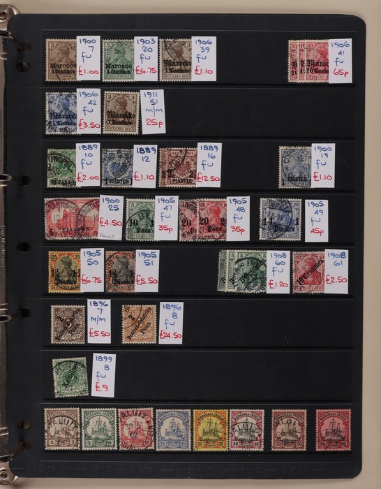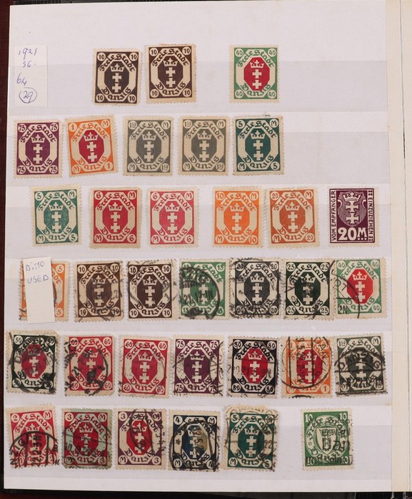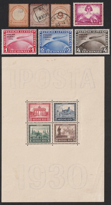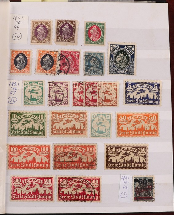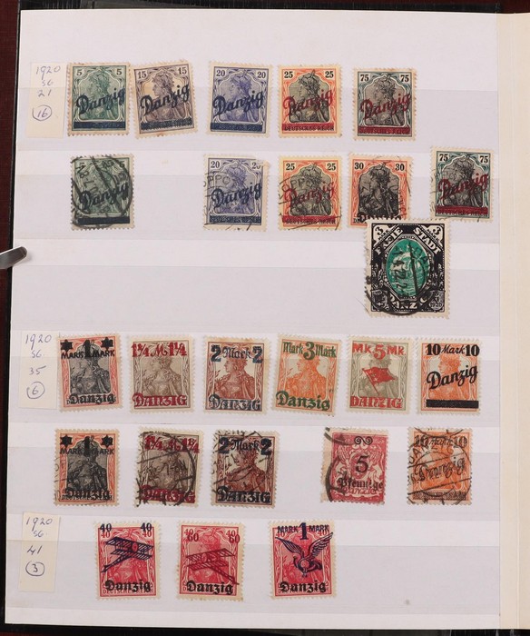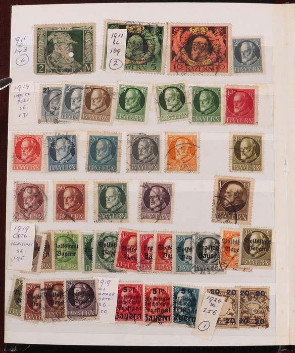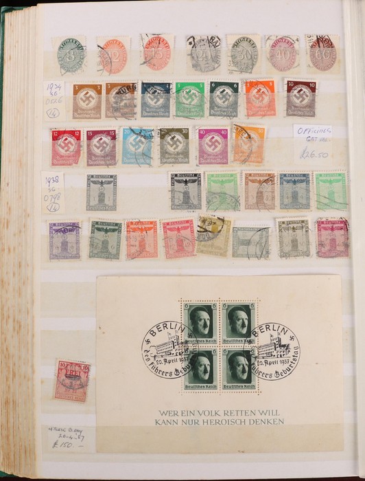 825 imageGermany: 1860-1945 collection in album & on hagners, starting from German States 1860-1920. Bavaria, Prussia, Wurttemberg etc inc Bavaria to 20M, Germany 1872-1945 inc earlies to 50pf, 1889-1901 to 3Mk, 1905 to 5Mk, then Inflation issues to Third Reich, 1928 Airs set to 4M, 1933 Zeppelin opt 2 & 4M, 1936 Olympics set on cover dated 30 JLY to Australia, Hitler M/S cds Berchtesgaden, 1939 Danzig opt set to 2RM, 1943 Armed Forces on piece, WWII Occupation opts inc Russia, General Govt & Kurland. Some 1930-40s Commercial covers, few blks with plate nos. Mainly G-VFU, few spots on earlies. SG est cat £5000+ = A$10,000. (1600 + 4 M/S) (Image1)