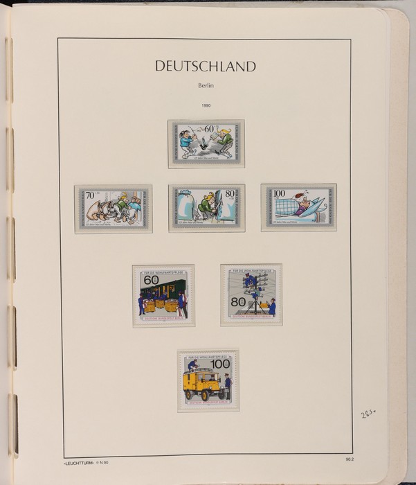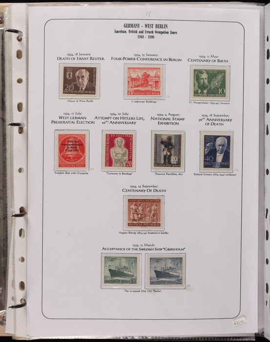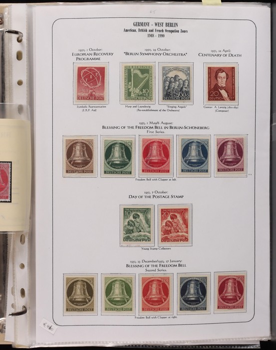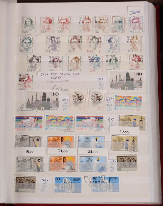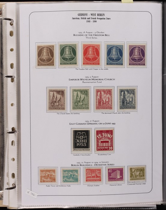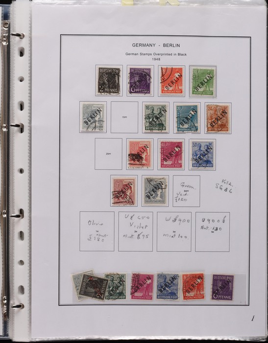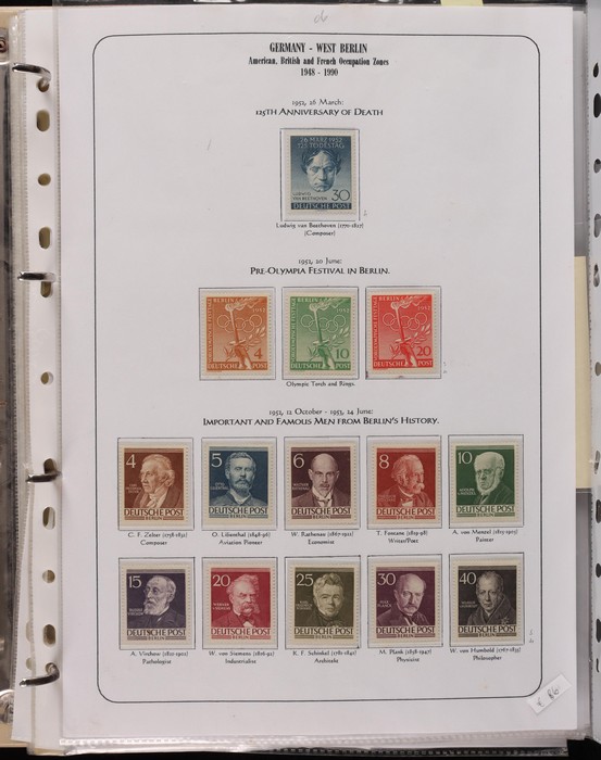 842 imageGermany - West Berlin, 1949-90 collection in Lighthouse hingeless album inc 1949 red Berlin opt to 1M, 1949 Berlin Relief Fund set & M/Sheet, 1952 Olympics set, 1952 Famous Berliners set, 1986 Famous German Women set, virtually comp from 1957-1990 with many sets, range of M/S, booklet panes, postal stationery etc. Mainly VF MNH from 1957, earlies mostly MLH & VFU. SG cat £6000 = A$12,000, plus high cost of album. (800 + 15 M/S, 10 P/Cs). (P) (Image1) (Image2) (Image3) (Image4) (Image5) (Image6) (Image7) (Image8) (Image9) (Image10) (Image11) (Image12) (Image13) (Image14) (Image15)