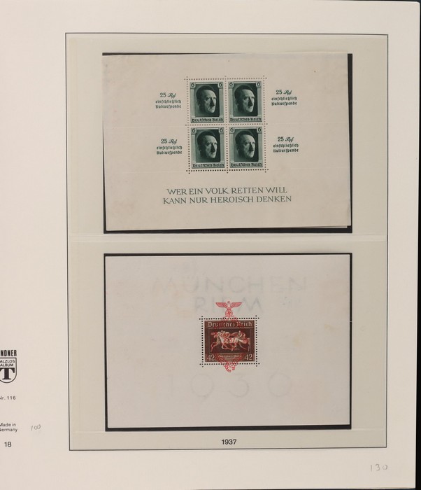 831 imageGermany: 1936-37 Third Reich M/Sheets comp with 1936 Berlin Olympics set of 2 cds Berlin Olympia Stadium, 1936 & 37 Brown Ribbon Charity set cds Munchen Riem Race Course, 1937 Hitler's Culture Fund perf & imperf 6+19f cds Berlin, 1937 Hitler's Culture Fund with margins rouletted cds Hamburg & Munchen. Superb fresh VFU/CTO all with special pmks. SG cat £700. (8 M/S) (Image1) (Image2) (Image3) (Image4)