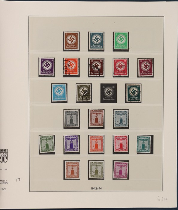 830 imageGermany: 1928-45 UK dealer's stock MNH inc 1935 Costumes set (SG cat £225), Winter Olympics & Lufthansa (£160), 1936 Olympics set (£160), 1938 Brown Ribbon (£190), 1939 Derby Anniv (£100), Art Day Women (3, £132), Postal Employees Fund (£110), Winter Relief (£75), 1940 Brown Ribbon (£150), Postal Employees Fund (£70) & 1945 SS/SA pr (£110), M/Sheets inc 1936 Olympics pr (£350), Brown Ribbon (2, £80), 1937 Hitler 6pf M/S with opt (SG MS638 cat £400), MS 635 (£90) & 1937 Brown Ribbon opt (£225). VF fresh MNH. SG cat £5600 = A$11,000. Marked UK retail £1800+ = A$3600 conservatively priced. Excellent lot for resale. (190, 7 M/S) (P) (Image1) (Image2) (Image3) (Image4) (Image5) (Image6) (Image7) (Image8) (Image9) (Image10) (Image11)