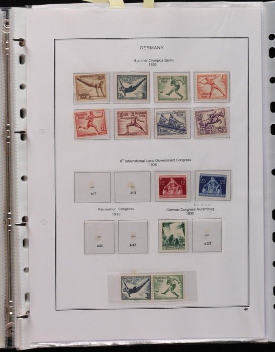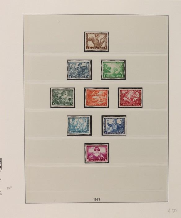 826 imageGermany: 1872-1945 collection in 2 VGC Lindner hingeless albums. 1872 Embossed Eagles range (30, SG cat £3600) inc 5M/UN, & 9/9k surch U (£750), 1875-1900 Arms, 1900 Reichspost to 3Mk, later to 5Mk inc new colours & wmks, then extensive defins near comp, Airmails, Officials, Inflation surch, commems & Charities, 1930 Iposta M/Sheet VF MLH (£700), 1931 Zeppelin Polar flight opt set M (£1100). 1933 onwards Reich issues inc Wagner set (£450), 1923 Charity Anniv opt singles (set of 4 £600), 1934 Workers (£120), 1935 Ostropa M/S in typical condition with stamps separated & margin damaged, 1936 Olympics M/S (£130), Hitler M/S (3, £180) & 1937 Brown Ribbon M/S (£90), 1939 Nurburgring opt set (£85), 1939 opt Danzig set (£85), Officials etc. Very near comp. F-VF M/MNH/U. All M counted as hinged, but MNH sighted. SG cat almost £13,000 = A$26,000. Valuable collection. (1050 + 9 M/S). (P) (Image1) (Image2) (Image3) (Image4) (Image5) (Image6) (Image7) (Image8) (Image9) (Image10) (Image11) (Image12) (Image13)