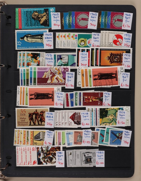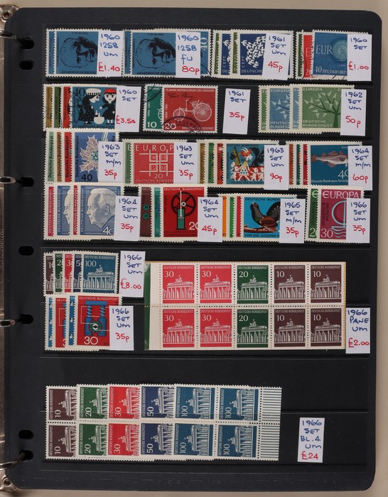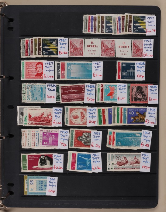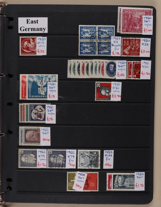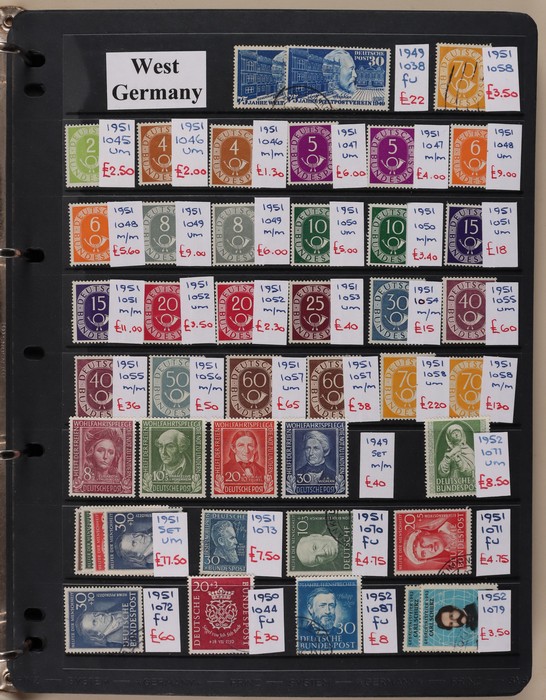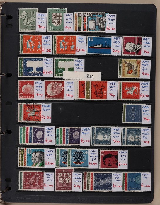 832 imageGermany: Post-WWII UK dealer stock mostly M/MNH with West Germany (500) inc 1949 UPU (2 U, SG cat £120), 1949 Refugee Relief set (£140), 1951 Posthorns inc 15pf, 20pf, 25pf, 40pf, 60pf & 70pf all MNH (£1200+), 1951 Relief MNH (£170), plus 30pf U (£150), 1952 Relief MNH (£150), 1953 Relief U (£120), 1959 Beethoven M/S (7, cat £217) & range to 1980s (total SG cat £6000+). Berlin 1948-80s (140, £6100+) inc 1948 black opt set M (cat £450), red opt set M (£1600), 1949 Buildings (£1000), UPU set M (£950), Goethe MNH (£375), Surch set M (£300), Relief MNH (£425), 1950 Orchestra MNH (£185), 1952 Berliners MNH (£160) & some more. East Germany (250) (cat £970) to 1980s inc 1950 Academy set M (£170) & 1955 M/Sheets (3, £95), plus odds earlier (85) inc Bavaria 1911 blks of 4, 1919 Free state opts top 3 vals from 2 sets U (£245). Also Colonies & POs (50+, £650+). VF fresh MNH M/MNH/U. Total SG cat £14,000 = A$26,000. Marked UK retail £4800 = A$9600 conservatively priced. Excellent stock for resale. (1000, 16 M/S) (P) (Image1) (Image2) (Image3) (Image4) (Image5) (Image6) (Image7) (Image8) (Image9) (Image10) (Image11) (Image12) (Image13) (Image14) (Image15) (Image16) (Image17) (Image18) (Image19) (Image20) (Image21) (Image22) (Image23) (Image24) (Image25) (Image26) (Image27)