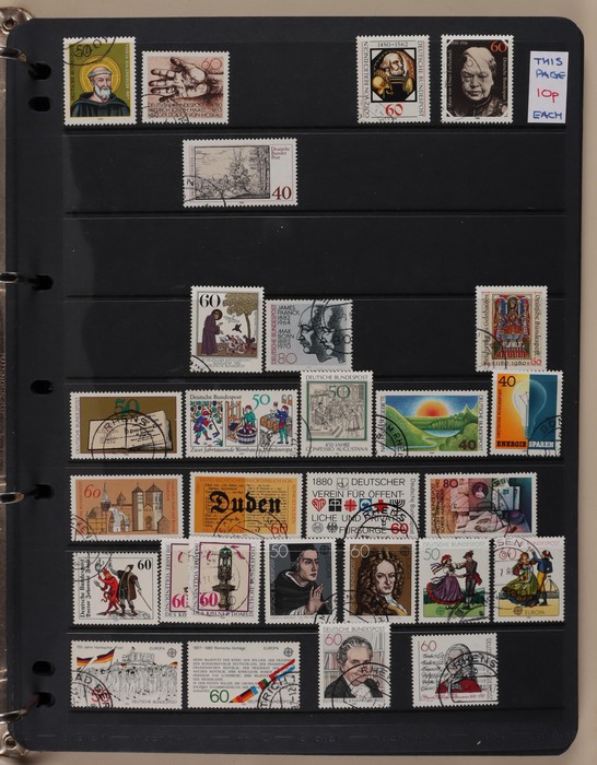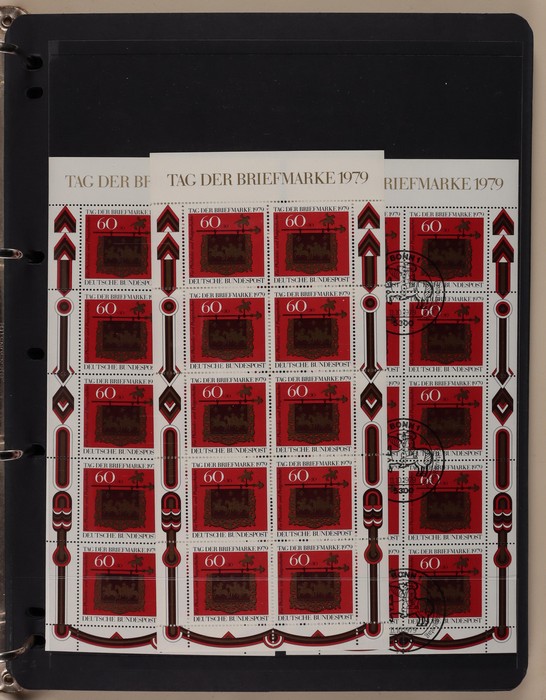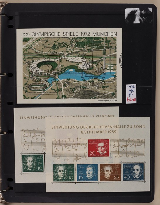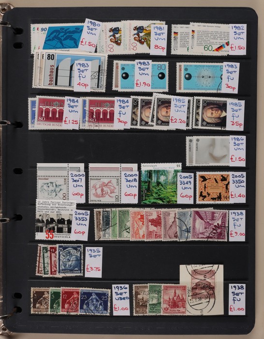 829 imageGermany: Collections in 3 albums- 1st volume to 1994 in Davo illustrated album, with 1870s Small Eagles (6), Large Eagles (9) to 3kr, 1900 Reich Post to 3M, 1902 Deutsches Reich to 5M, all G-F/VFU. Then mostly M inc 1920 Bavaria opt Deutches Reich to 20Mk (ex 3Mk), 1924-27 Castles set, 1927 ILO opt set, 1933 Reich stag set, 1933 Welfare 25pf, 1934 Welfare Fund set UN, 1935 Welfare Fund set, 1936 Olympics M/Sheet, 1936 Brown Ribbon M/Sheet, 1937 opt M/Sheet MNH, Belgium 1943 Waffen set, Michel IX/XIV in sheets of 4 hinged in selvedge (cat €600); 2nd album with Berlin 1949-1990 a solid mostly F-VF M-MNH collection inc 1999 Berlin black opts to 5Mk, 1999 UPU set, 1949-54 Building to 5Mk, 1950 Orchestra set M, 1951-53 Bell (all 3 sets), Bell at centre MNH, others M, 1952 Olympics set, 1952-53 Berliners set, 1970 President set, 1975 Industry set, 1985 Famous Women & 1987 Tourist Sights sets MNH. 3rd album with West Germany inc 1951 St Mary's set, 1955-1980 good range MNH inc 1959 Beethoven M/Sheet. Largely F-VF. SG cat £6600 = A$13,000. (2200, 6 M/S) (Image1) (Image2) (Image3) (Image4) (Image5) (Image6) (Image7) (Image8) (Image9) (Image10) (Image11) (Image12) (Image13) (Image14) (Image15) (Image16) (Image17) (Image18) (Image19) (Image20) (Image21) (Image22) (Image23) (Image24) (Image25) (Image26)