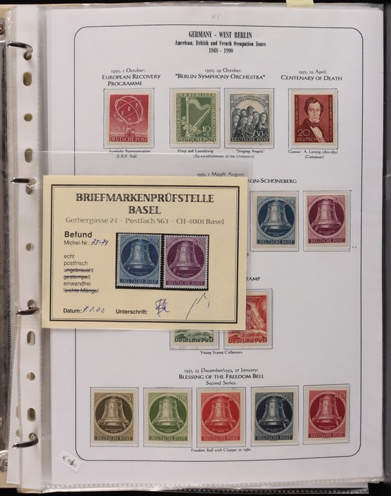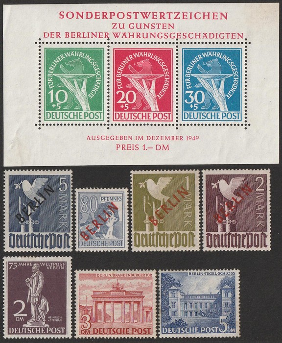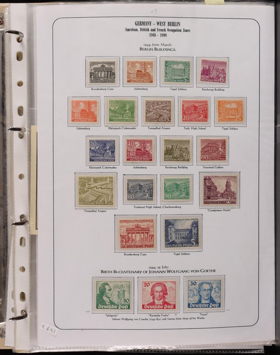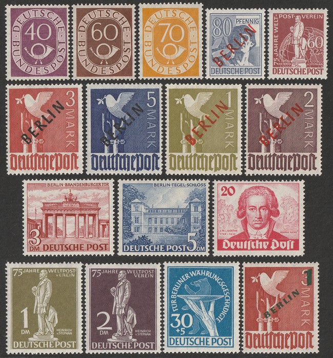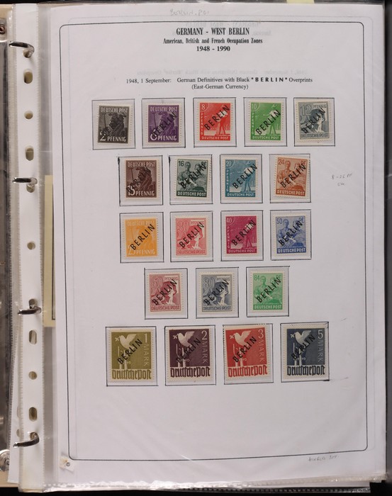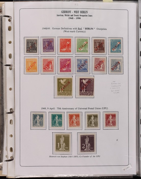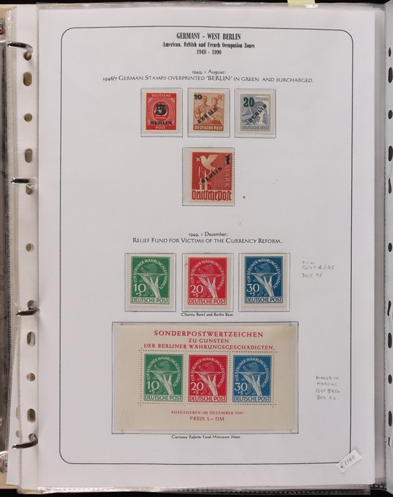 841 imageGermany - West Berlin: 1948-90 collection virtually comp inc 1948 opt set to 5Mk, 1949 red opt set to 2Mk, 1949-54 Building set to 5Mk, 1949 Goethe set, 1949 Surch set to 1Mk, 1949 Relief Fund + M/S, 1949 UPU set to 20Mk, then various comp sets & M/S to 1990, Generally F-VF M/MNH, most issues from 1964 MNH. SG cat £8500+ = A$17,000. All diff & nice collection. (800 + 8 M/S) (P) (Image1) (Image2) (Image3) (Image4) (Image5) (Image6) (Image7) (Image8) (Image9) (Image10) (Image11)