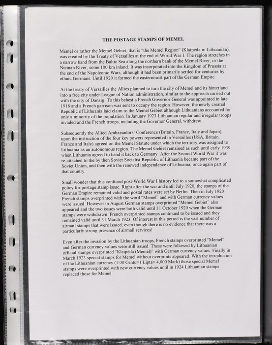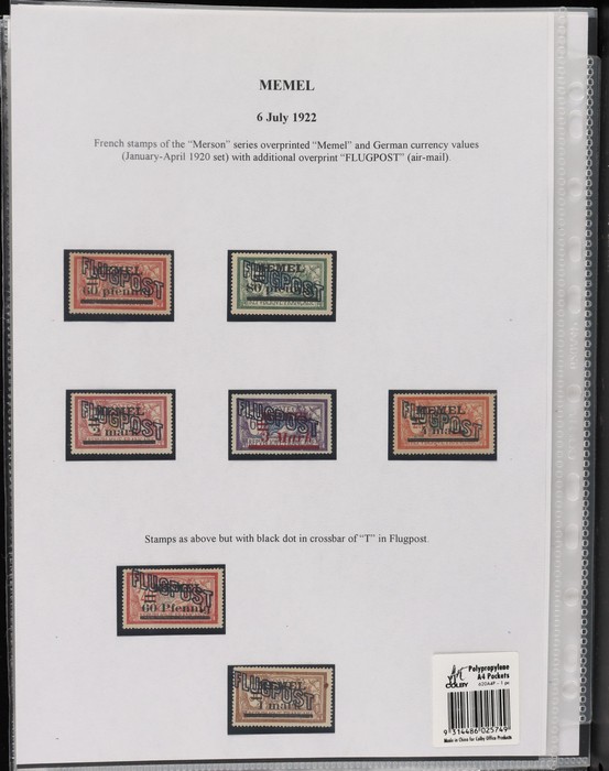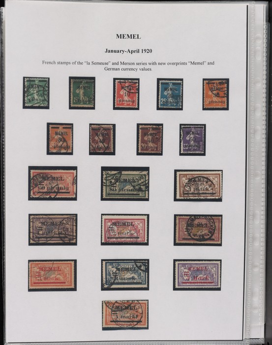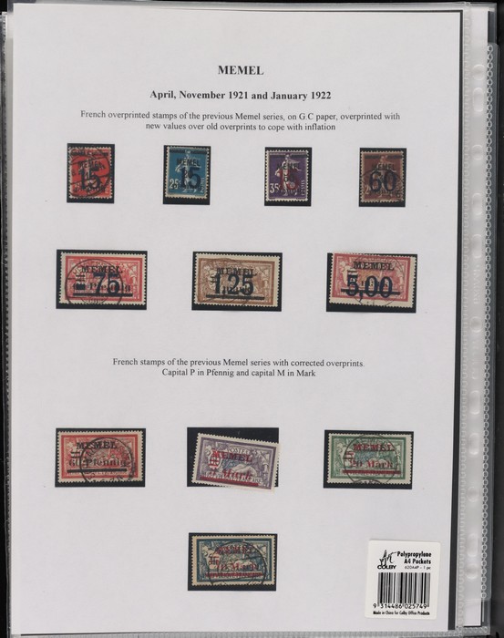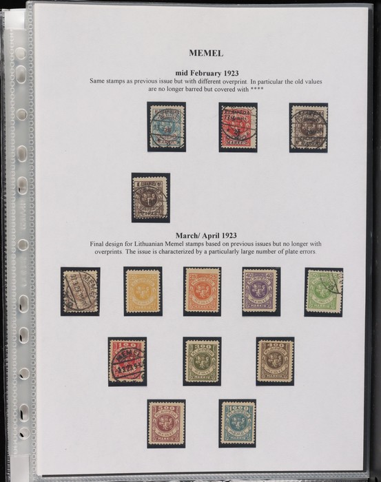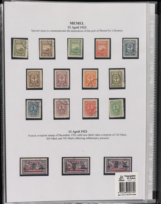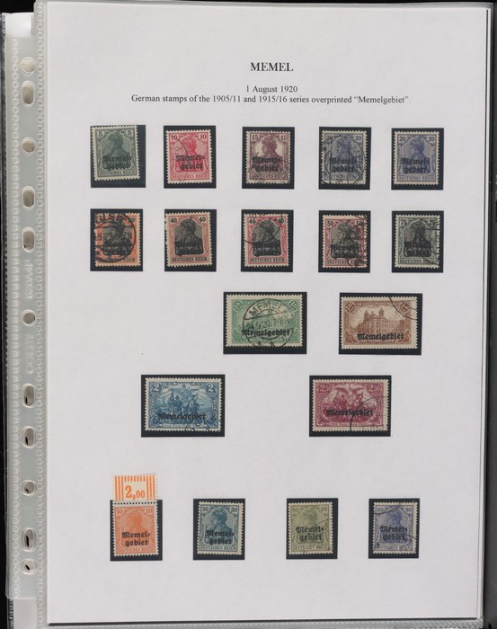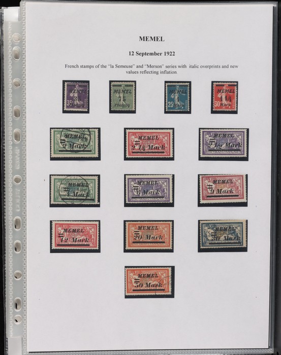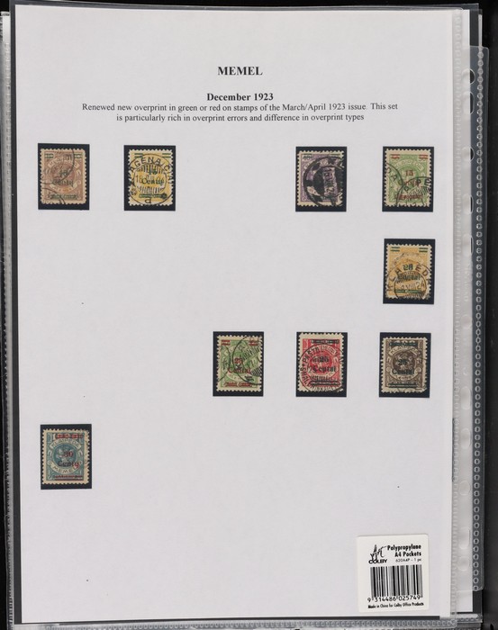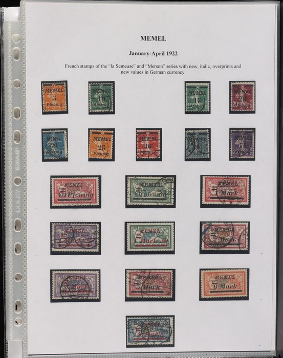 835 imageGermany - Memel: 1920-23 collection on pgs in binder. 1920 opt Germania 5pf-20Mk. 1920 opt French issues 5pf-4Mk. 1922 opt French issues 5pf-9Mk. 1922 Surch to 100Mk. 1922 Airmail set to 9Mk & 'FLUGPOST' opt to 9Mk. Lithuania Occup 1923 opt Arms to 400Mk. 1923 Arms to 100Mk. 1923 Pic set to 300Mk. 1923 Inflation opt to 600Mk. 1923 'Cent' opt Pic to 1L. F-VF M/U. SG cat £1700+ = A$3300. (Image1) (Image2) (Image3) (Image4) (Image5) (Image6) (Image7) (Image8) (Image9) (Image10) (Image11) (Image12) (Image13) (Image14) (Image15) (Image16) (Image17)