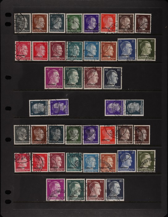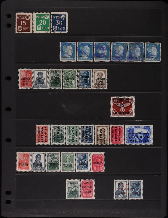 837 imageGerman Occup of Baltics & Russia: 1941-44 collection used inc 1941 Ostland opt Hitler set 1pf-80pf, Ukraine opt Hitler set, Estonia swastika set, Latvia opt set & Kurland opt eagle. Also 1941 Lithuania 3-line vertical opt (7), Zarasai opts (4), a few others. VFU/CTO. Mi cat €590. (77). (Image1) (Image2)