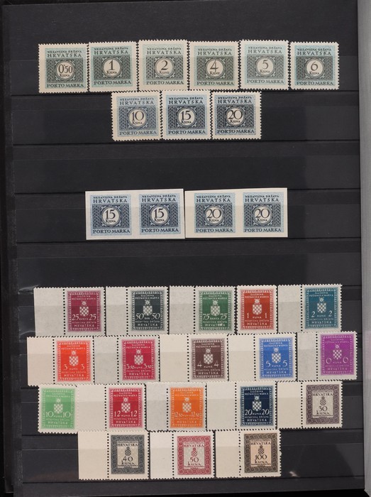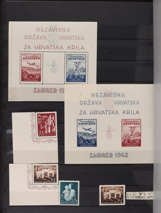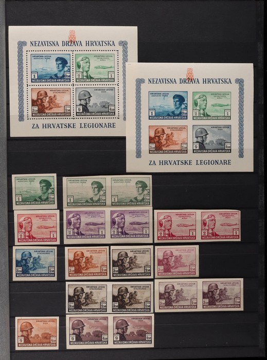 839 imageGerman Occup Croatia: 1941-45 WWII MNH collection in s/book inc 1941 opt Yugoslavia King set to 30D. 1941 Brod Exhib opt set with tabs. 1941-42 Pic set to 100K, plus tete-beche pr to 20k. Also horiz prs, to 10k error imperf vert & 30k vert pr imperf horiz, plus 1.50k imperf pr. 1942 Aviation M/S perf & imperf. 1942 surch 0.25 on 2k tete-beche blk of 4. 1943-44 Castle 3.5k imperf pr, rare unissued essay design. 1943 President 12k + 8k M/S perf & imperf. 1943 Zagreb Exhib 9k, 'S' variety. 1943 opt 18k, offset variety 1943 Legion range of imperf proof colour trials. 1943 700th Anniv, double perfs variety, plus sheetlet. 1943-44 President set to 1010k - 1944 Postal set sheetlets. 1945 Storm Division set with initials OA at base (reprints), 1945 Feldpost opt Military stamp (rare unissued). 1945 Postal Employees set, sheetlets, plus 50+25 sheetlet with' white dot obliterates, plus sign' variety. Mostly VF fresh MNH. Mi cat €3200+ = A$5300+. Unusually nice quality collection. (550 + 21 M/S or sheetlets). (Image1) (Image2) (Image3) (Image4) (Image5) (Image6) (Image7) (Image8) (Image9) (Image10) (Image11) (Image12) (Image13) (Image14) (Image15) (Image16) (Image17) (Image18) (Image19) (Image20) (Image21) (Image22) (Image23) (Image24) (Image25) (Image26) (Image27) (Image28) (Image29)