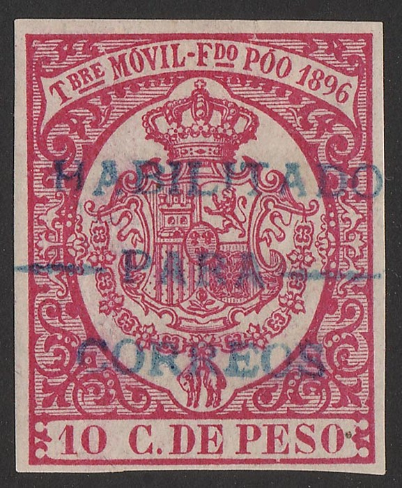 'Habilitado Para Correos' blue opt Fiscal 10c rose-red, inscribed 'TBRE MOVIL - FDO POO 1896', imperf. VF fresh M, 4 margins. Sc 40. SG 32 cat £40, Edifil 41B cat €41.