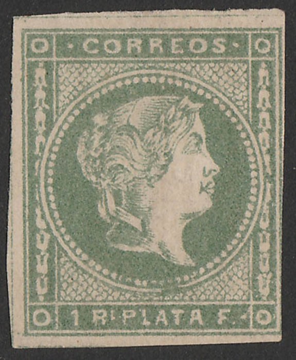 'HABILITADO PARA CORREOS 10 Cen de Peseta' black opt Fiscal 50c green imperf. F-VF U, almost 4 margins. Sc 98. SG 93 cat £70. Ed 58AA cat €114. (Image1)